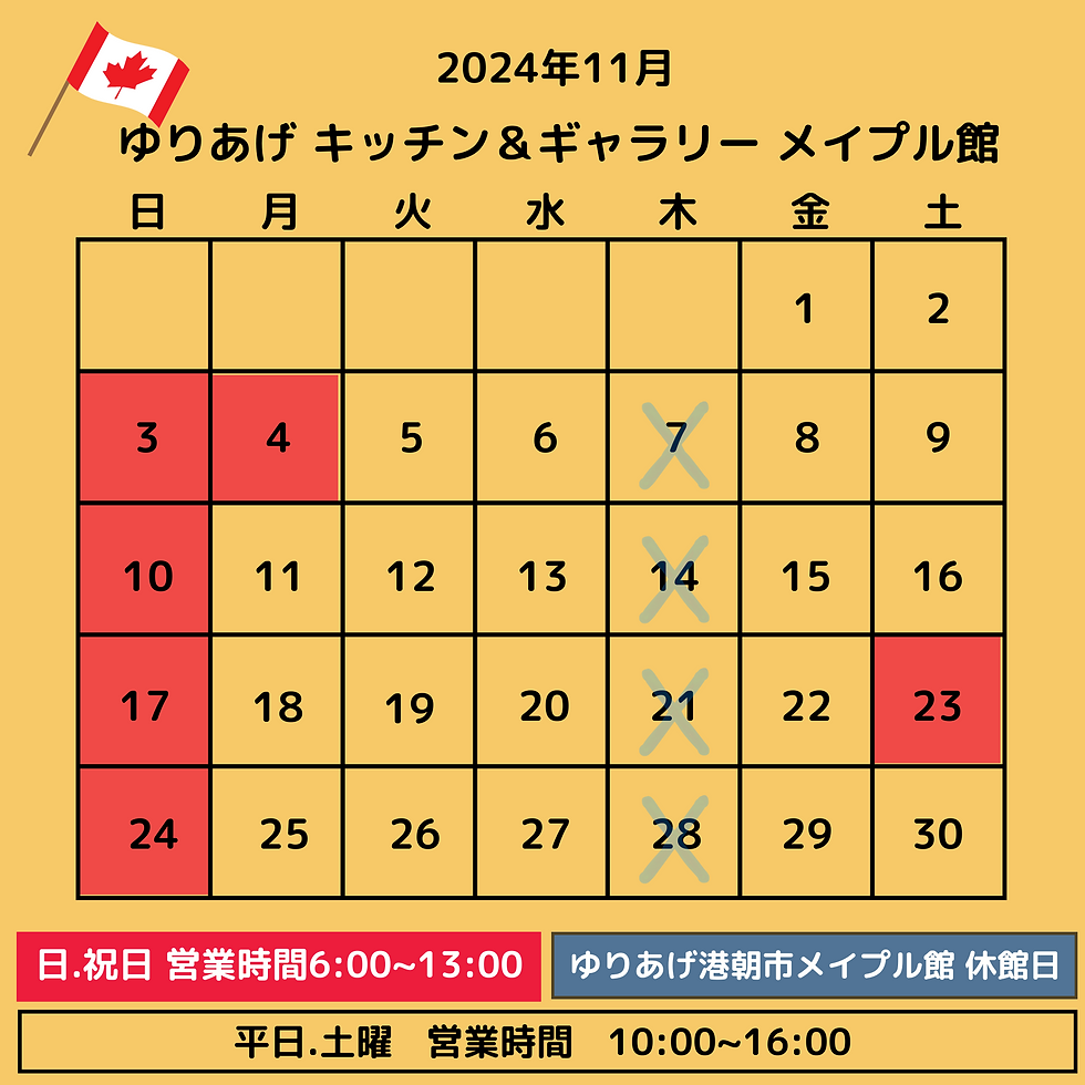 2024年11月営業カレンダーゆりあげ港朝市2024年10月25日読了時間: 1分更新日:2024年12月2日<ゆりあげ港朝市>露店が立ち並び賑わう市場開場時間毎週日曜・祝日の6:00〜13:00 <フードコート&お土産>営業時間日曜祝日6:00〜13:00平日と土曜の10:00〜16:00※定休日は毎週木曜日初めて来場される方へ皆さまのご来場をお待ちしております。